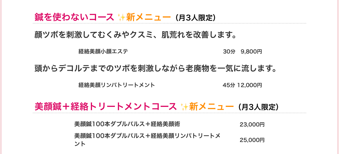 ご要望にお応えして、開店当初のメニューが復活しました!月に3名様だけのプレミア枠です。先着順になりますのでご了承くださいませ。◉美顔鍼+経絡トリートメントコース・美顔鍼100本ダブルパルス…